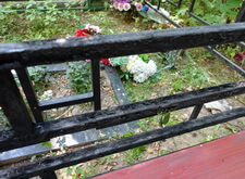 Последовательность работы стандартная. Во-первых, сжечь старую краску, во-вторых, зачистить ограду до металла, после покрыть грунтом чистый металл и покрасить черной краской. После покраски убраться на могиле. Далее на фото обожженная краска на ограде.