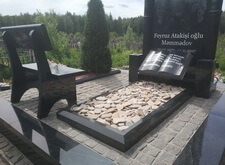 Собираем лавочку, устанавливаем её напротив надгробья. Цветник у подножья мемориальной стелы наполняем светлыми камнями. Под полукруглую арку памятника укрепляем вырезанную из гранита фигуру полумесяца.
